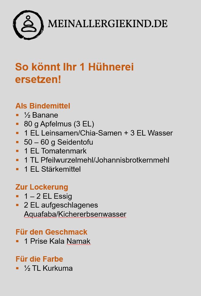Als Behandlung wird das Vermeiden des Allergens, also Weglassen des Hühnereis empfohlen: Spiegelei, Rührei, gekochtes Ei, Omelette aber auch Hühnerei in verarbeiteter Form wie Pfannkuchen oder Kuchen, Kartoffelpuffer, Frikadellen, Pudding, manche Cremes oder Eissorten sind zu meiden. Hühnerei wird häufig als Binde- Lockerungs oder Dickungsmittel verwendet. eine Übersicht über alternativen Ersatz findet Ihr unten im Download-Bereich.